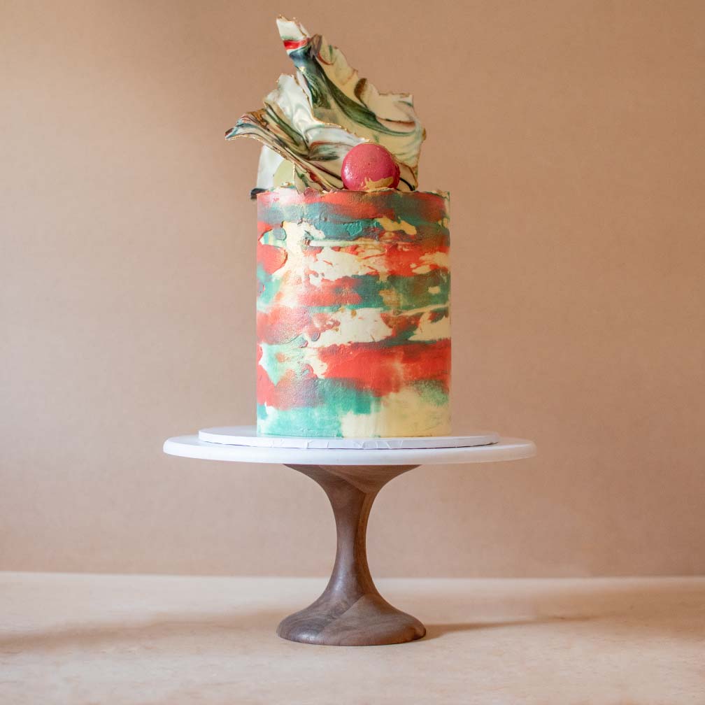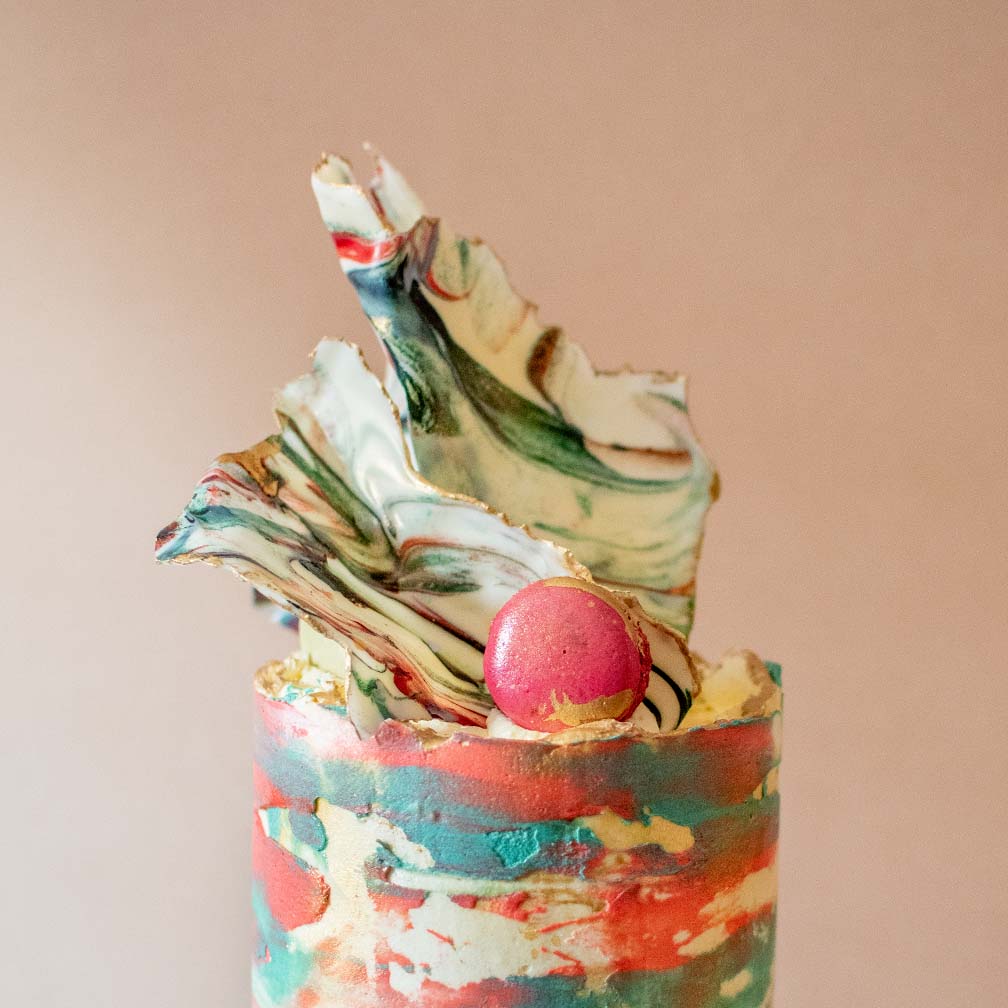 This design is both classy and elegant with the touch of gold edges on the colourful chocolate shards. Each cake will have its own its own unique feel with various shards that are decorated with Christmas colours. Finishing touches are made with pistachio and raspberry macarons and a watercolours display on the frosting.